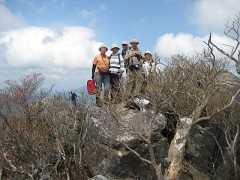 | 五葉岳山頂(強風で帽子が・・・) | ||