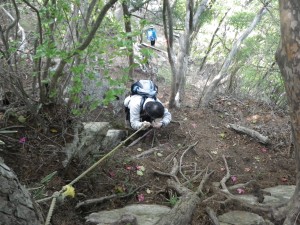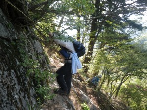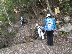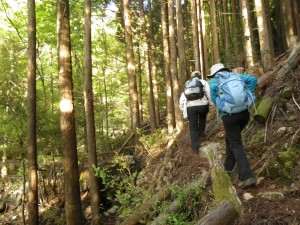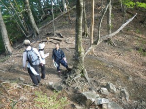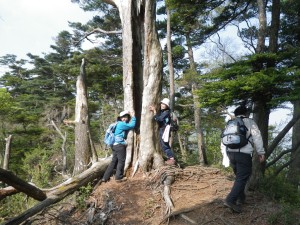 | 振り返る | 巨木に抱きつく奥様方 | 急斜面を降る |