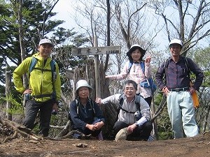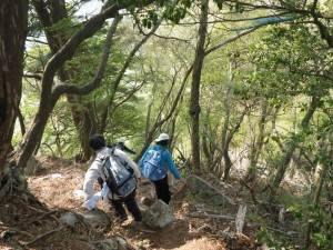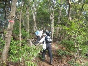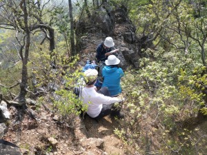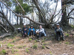 | ミツバツツジの花も結構ある | もう一息 | 山頂にて(MORIさん撮影) |