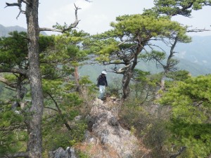 | 休憩 | 手前の岩峰の岩場を歩く | 休憩した場所の下を歩く |