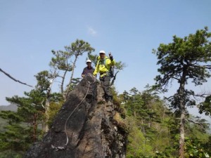 2012年5月6日(日)晴れ ■出発時間:午前6時00分(宇土内登山口) ■メンバー:MORIさんご夫妻、あこちゃんご夫妻、カラスの5名 前ページ(二ツ岳)へ 昨夜は、藤川内渓谷にある温泉「湯〜とぴあ」で温泉につかり、またまたお酒を飲んで早く寝た。朝食は奥様方からサラダやバナナをもらったりで栄養十分だ。犬流れ登山口まで夏木林道を移動する。道は昨日の二ツ岳よりもはるかに状態が良い。何しろマイクロバスが入るくらいなので。そう言えば、2009年の5月にここ犬流れ登山口から歩く予定であったが、崩落で通行止めになっていたため止む無く夏木新道を歩いた。鋸尾根を歩けるということで楽しみだ。6時20分、車を停めて出発。登山口からすぐに急登が始まる。尾根道とはっきりとしたきたらシャクナゲの花が迎えてくれた。松の巨木も見事である。ブナの木が増えてきて登りきると7時20分稜線の犬流れ分岐に出た。風の通り道なのかかなり強いが、ここで一息いていよいよ尾根歩きである。ブナの木とミツバツツジの花を見ながらヤセ尾根を歩く。最初のピークを登りきると急斜面のロープ場を降る。降りきると今度は梯子を登る。そしてまた、急斜面を降る。そして何度かアップダウンして遠くに鹿納坊主が見えてくる。気がつかなかったがおそらくこの間が小鋸であろう。目の前に急峻な岩峰がある。足元にはイワカガミの花が群生していてしばらくここで休憩をする。岩の下をトラーバスして垂直に近い岩壁を斜めに登り切るとそこは北アルプスの大キレットで経験した飛騨泣きを通過するような岩場に出る。太いロープが張ってあるが、それを持ちながら歩くとすると体が倒れてしまい余計に危ない。ここは岩を手で直接つかみ三点支持で進むのが良い。(不安であればこのロープにシュリンゲ&カラビナで確保をすれば良い)ここをクリアして岩壁をトラバースして梯子を降るとまたまた登り始める。振り返ると今通ってきた岩場が眼下に見える。9時30分、岩場のヤセ尾根を過ぎると夏木新道との合流地点に着く。無事鋸尾根を通過した。天然のアスレチックは、大人だけの楽しみである。しばらく休憩をして山頂目指し、急斜面を登り始める。アケボノツツジの花が残っていて楽しませてくれる。10時ちょうど山頂に着いた。前回来た時は、アケボノツツジが満開であったが、今回はちらほらでほぼ終わっていた。年によってこうも違うのかと思うと前回はとても幸運だったと言うことである。しかし、その代わりか、シャクナゲの花がたくさん咲いていて和ませてくれた。しばらく休憩をして下山開始である。帰路は夏木新道を降る。船石、あけぼの平、桧見台と降り、11時35分、登山口に全員無事下山。ここから林道を歩き、犬流れ登山口に停めてある車まで戻った。ひやひやした場面もあったが、なかなか面白いコースでGW最後の締めくくりの山として最高だった。そして昨日に続いて道の駅宇目のレストランで豪華な昼食をして帰路に就いた。今回も全ての計画をしていただいたリーダのMORIさんには感謝の限りである。また、今回は独身だった私?を色々とお世話いただいた奥様方や足の豆の痛さも克服し、最後まで歩き通した(「笑い通した」の方がいいかな)花ちゃん(ちゃんで失礼)に感謝を述べたい。そして自然に山にいつも感謝です。(帰宅して体重を計ったら2Kgも増えていました。こりゃいったいどうなってだぁー) <コースタイム> 犬流れ登山口-(60分)-犬流れ分岐-(100分)-夏木新道合流点-(20分)-山頂-(80分)-夏木新道登山口-(10分)-犬流れ登山口 ※休憩時間は含まず。全行程で約5時間半でした。 |