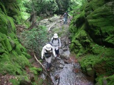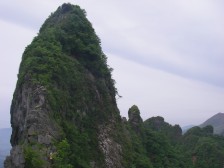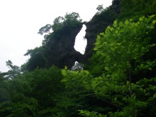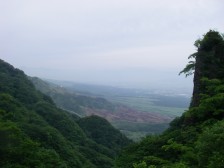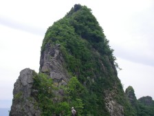 ヤカタガウドの「ウド」は山岳用語の「ウト」、つまり狭い谷間のことを言うようです。登山口には登山届けがあるので記入します。すぐに砂防堰堤下を横断し、堰堤を超えます。ガレバを歩き苔むした道を歩きます。再びガレバとなり高度を上げると左手に標識で天狗岩とありますので林の中へ進みます。自然林の中を気持ちよく歩き急登を喘ぐと岩場が見えてきます。視界が開け天狗のコルに着きます。天狗峰へはそれなりの装備と技術がないと危険です。(岩は板状で剥がれやすい)スリルと展望を味わったら東峰へ縦走です。ヤセ尾根歩を歩きます。途中、「危険立ち入り禁止」の看板があって迂回しながら進みます。また道が切れていてジャンプするところもあります。(幅70cmぐらい?怖ければ下に降りれます)振り返ると尖った天狗峰が見えます。