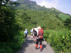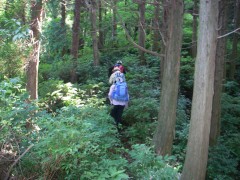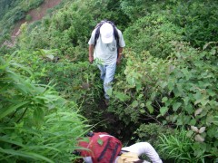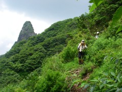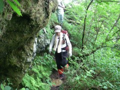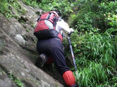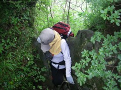 2010年7月25日 天気 晴れのち雨 遊山歩7月度例会は阿蘇の根子岳である。今回は未踏の見晴新道を歩く計画である。見晴新道と名がついているのできっと見晴らしが良いだろうと思っていたが、ヤカタガウドコースと比較すると確かに高岳が途中何度か見れたぐらいで特に見晴らしが良いわけではない。しかし、結構鎖場も多く、なかなか手ごわいコースであるので舐めてかからない方が良いようだ。参加者はMORIさん、信ちゃん&俊ちゃん、KENさんアコちゃん、そして私たち夫婦の7名である。午前6時に豊前おこしかけに集合。途中、玖珠の道の駅で休憩をとり登山口手前の駐車スペースに着いたのは午前9時前だった。 GPS歩行奇跡(信ちゃん作成) <アクセス> 国道57号線を大分方面へ向かいJR宮地駅の先のT字路を右折(パチンコ屋さんのところ)し、踏切を超え、直進すると狭い道の2差路にぶつかる。日の尾峠と桜ケ水と書かれた標識があるが左折し、日の尾峠を目指す。狭い道路が続き、別荘地を抜けると林道らしき道となる。三叉路にぶつかると(お地蔵さんがある)左折し、すぐに駐車スペースがある。(ヤタカウド登山口は、三叉路を真っ直ぐ進むが、道は狭い) <コース詳細> 三叉路の真中のコンクリートの道をしばらく山手に歩きます。(突き当るとヤタカウド登山口)途中左手に木の注意書きの表示(写真下)があるのでそこから尾根に取り付きます。この時期は草が茂って道が良くわかりずらいので注意です。急な勾配から尾根に取り付きしばらく急登に喘ぎます。一旦下って再び上りとなりアーチ状の岩を見て巨岩を通り抜けると見晴らしの良い場所となります。しばらく歩くと岩壁が見えてきて鎖を持ってトラバースします。岩場が多くなり沢伝いに上ると今度はロープを頼りに岩を下ります。次ページへ |