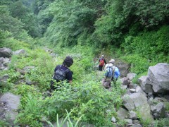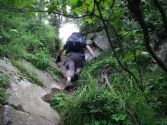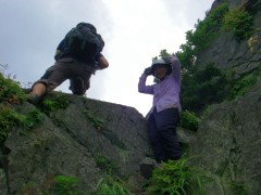 | 前ページからの続き 岩を降り再び上り返すと天狗峰と東峰の縦走路に出ます。稜線沿いの縦走路は途中崩落したところがあって迂回路ができています。ここからのコースは2008年6月14日の日記と同じです。山頂はトンボがたくさん飛んでいて天狗峰や今日歩いた見晴新道の尾根、そして高岳が見渡せます。ちょうど12時になるのでここで昼食です。昼食を済ませたら来た道を戻り、天狗のコルよりヤカタガウドを下山します。(2008年6月14日の日記)今回は最後に雷雨に会い、雨具を着ましたが、かなり強い雨で濡れてしまいました。しかし、それまで暑さでまいっていたので恵みの雨だったかもしれません。とにかく今回は汗を大量にかきました。帰りにMORIさんとアコちゃんと4人で豪華な夕食を済ませて帰ったのは言うまでもありません。 終わり |