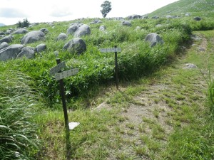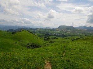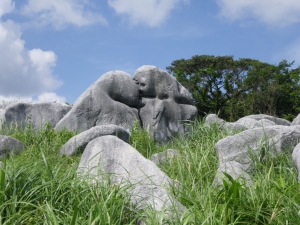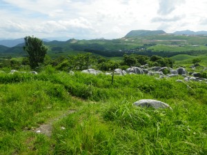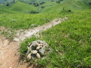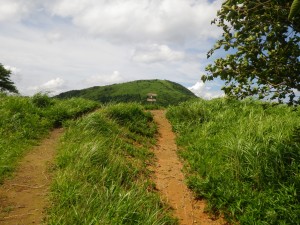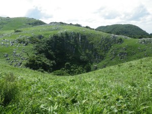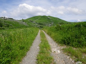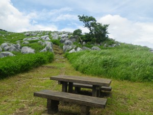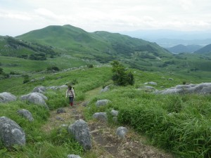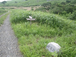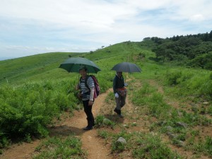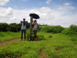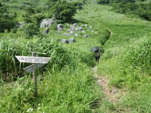 2012年7月15日(日) 天気 曇り ■出発時間:午前11時00分(自宅) ■メンバー:家内と私 先週から停滞した梅雨前線で天気は大荒れ。九州北部は被害が広がった。三連休と言うことで行楽地は、稼ぎ時ときっと期待していただろう。私たちも本当は雲仙に一泊で出かける予定であったが、急遽取りやめた。しかし今日は朝から晴れ間が出るほど夏らしい空だ。結局、三日間も家に閉じ込められるのがいやで昼前から妻と二人で近くの貫山へと出かけることにした。今回は茶ケ床園地に車を停めて砂利道を西へと歩く(目白洞と反対)いつものコースだ。12時05分、空を見るとずいぶんと雲行きが怪しい。雷が鳴り出したらすぐに撤退だ。と言いながら下界のあの暑さもどこへやらと軽快に歩く。砂利道から道標どおり「貫山・中峠」方面へと登山道へ進む。鉄パイプが道に沿ってあるが、昔ここは牧場だったのでその時に使用していたのだろう。両手に道標がある場所に出ると左に進む。草原の中の道は広くて歩きやすい。徐々に勾配がきつくなりベンチで水分補給である。既に12時30分でランチタイムは過ぎている。家内に『腹減ったか?』と聞くとめずらしく『減らない』と答えたのでいつもの場所まで我慢してもらうことにした。道は再び狭くなり登山道らしくなる。石の羊の群れの中を歩き平坦になると大平山(おおへらやま)からの縦走路にぶつかる。(12時40分)道標は「四方台を経て貫山へ」と丁寧に書かれている。左に進む。腰のあたりまで延びた草がうっとおしいが、オカトラノオがたくさん咲いていて和ましてくれる。石の羊だらけの道は、急斜面の降り道となり、降りきると再びなだらかな上りとなる。しばらくウツボグサの花に囲まれ、羊たちと戯れながら歩く。13時02分、鞍部に出ると十字路で左は「井出浦・大穴」、右は「中峠」方面だ。ここは正面の急斜面を直登する。とにかくきつい斜面だ。振り返ると大平山や塔ケ峰が見える。空が曇っていることもあってそれに風もあるのでへたばらずに登りきった。平らになるとここはいつもランチにする場所でちょうど四方台の肩になる。ランチをとっているといつのまにか雲もずいぶんと散ってしまったのか陽射しが強くなった。それでもここは風の通り道でもあるので日蔭はないが涼しい。昼食を食べたら出発だ。四方台から北へ貫山を目指す。目の前に山ガールさんが歩いて来た。女の子ばかりの4人組だ。仲間に入りたい気分だが、きっと入れてくれないだろう。そのあと、今度は傘をさした男女のペアが歩いてくる。どうも見覚えのあるお二人だと、両眼合わせて視力1.0の私は、目を凝らしながら近づく。気付いたのは私の方でやっぱり豊津の信ちゃんご夫妻であった。久しぶりなので少し立ち話をする。元気そうで何よりである。陽射しは、かなり厳しくなったので家内も日傘をとり出した。貫山までの上りも結構きつい。14時8分、ようやくの思いで登りつめた。誰もいない山頂は貸し切りである。我家を見つけたりして展望を楽しみ山頂を後にする。降る途中で男女1組にすれ違う。どこかでお会いしたような人だ。林道手前で真っ黒い蛇が横たわっていた。蛇も暑かろうに。四方台を過ぎたらすぐに右の尾根(石の積まれたケルンが目印)をドリーネに向かって西に降る。道は左にカーブしてドリーネを右に見て真っすぐ南に降って行く。中峠への分岐標識にぶつかると右に進みキス岩の標識を見る。ここからキス岩に立ち寄ることに。何度見ても面白い。道標まで戻ったら先に進む。すぐにまた茶ケ床園地迂回路の道標がある。往路の時に見た道標である。ここからは往路を戻る。15時14分、無事茶ケ床園地に着く。雨にも雷にも遭わず。今日も自然に感謝である。 <コースタイム> 茶ケ床園地P-(40分)-縦走路出合い-(35分)-四方台肩-(30分)-貫山頂上-(60分)-キス岩-(20分)-茶ケ床園地P ※休憩時間含まず。全行程で約3時間15分でした。 |