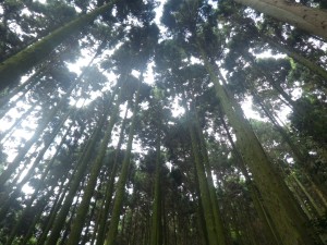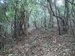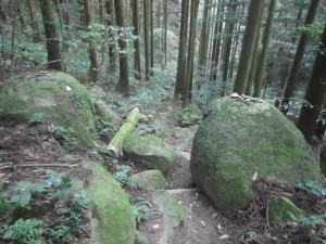 | 巨石の間を通過 | きれいな杉林である | 道が分かれる(9:07) |
