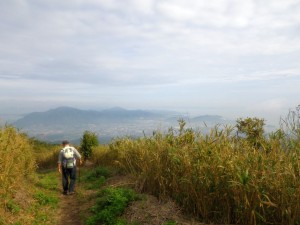 2013年10月20日(日) 天気 曇り ■出発時間:午前8時30分(自宅) ■メンバー:単独 富士山が世界文化遺産に指定され、富士山ブームであるが、富士山に例えて各地に○○富士と別名が付けられている山がある。私の住むこの町にも企救富士と呼ばれる貫山がある。毎日この富士を見ながら生活ができて幸せである。車道歩きが長いが自宅から歩くことにした。公共交通機関だと西鉄バスがJR下曽根駅から上貫まで行けばよいが、便が少なく、朝ちょうど良いのがない。(以前はあったが) 駐車場も特にないのでこちらからの登山は少々不便である。昭和池の方から林道を車で移動して林道登山口に駐車する手もあるが林道が結構長い。 今朝はガスっていて往路でその美しい富士型の山容を写真に収めることはできなかったが、帰る頃には天気も回復し、振り返ると見送るように姿を現した。毎日見ているが飽きない山である。 朝、8時前に出て9時半過ぎには山頂に着いた。コーヒーを淹れようと思いザックからコーヒーセットを出すが、何か足りない。え!バーナーがない。ガスもパーコレータもあるのに・・・・。 山頂でのコーヒーは格別なのに何と忘れるとは残念。 結局、誰もいない山頂でしばらくボーっとしていた。男性が一人登ってきたがすぐに降りていった。下山は往路を戻るのだが、ここで以前山の会でご一緒だったT婦人が数人の方々と登って来た久しぶりにお会いするがお元気のようで何よりである。そして林道の登山口まで戻るが、時間も早いので地図を見て散策することにした。 林道を東に少し行くと道がある。九州電力の苅田分岐線とある。しっかりとした道なのでたぶん地図にある道だろうと降ってみる。ケルンもあってこれだと地図どおりかなと思っていたが途中で道がなくなってしまう。九州電力の苅田分岐線の道しるべがあるのでそちらに少し歩いてみたら竹林の中を登っているようなのでここで諦め、元の登山道へと上り返す。こんな時、GPS付きの地図があれば便利なんだが・・・・ 帰宅してGPSの軌跡を見るとやはり間違いない。途中で道がなくなっていたようである。 昼過ぎに無事帰宅。今日も山に自然に感謝!! |