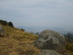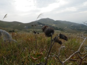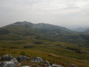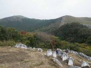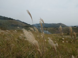 | 左に貫山 | 大平山(おおへら)頂上 | 野焼きの煙と黄褐色のススキ穂 |