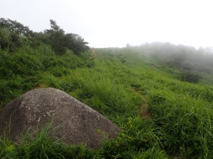 | きつい斜面を登る | 貫山頂上(9:19) | ガスで視界は悪い |