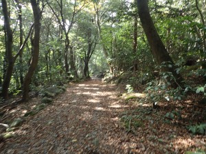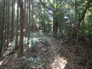 | 大きな石がある | 落ち葉でフカフカの道を降る | 杉林を通過 |