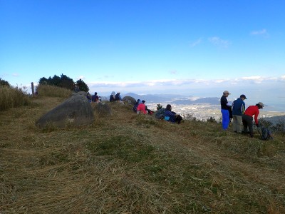 山頂では大勢の登山者がランチタイムを楽しんでいた。私もここでランチタイム。眺めは良く、草原の気持ちの良い広場の山頂は貫山の大きな魅力の一つだ。
