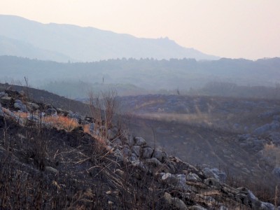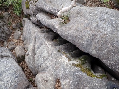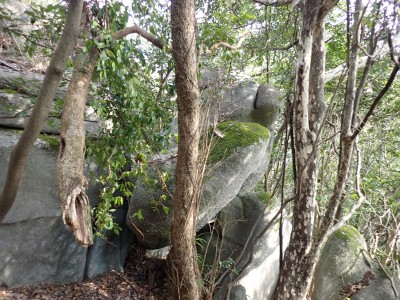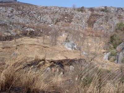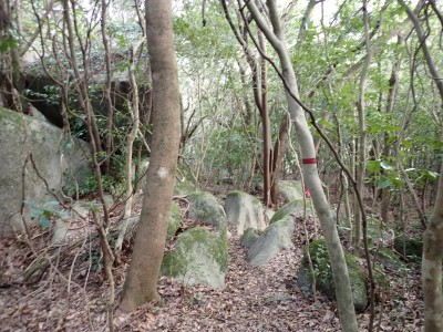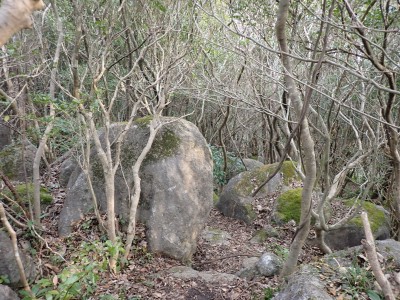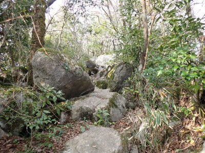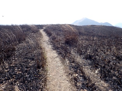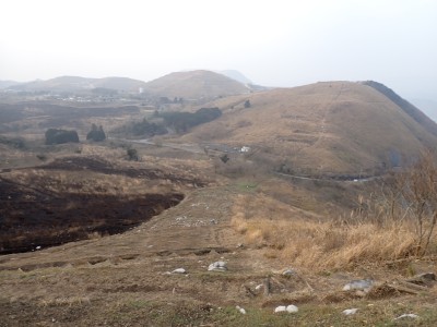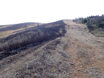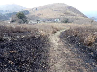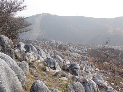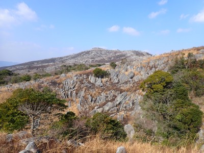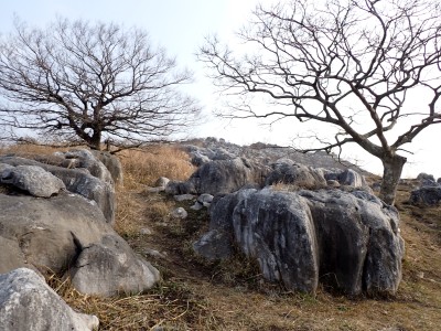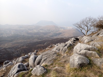 昨年の10月以来、平尾台を歩いていないので野焼きシーズンだが歩いてみることに。今回は吹上峠から貫山へ。でもそれだけなら面白くないので久しぶりに塔ケ峰へ。大平山から貫山方面へと足を延ばすと途中で印がある。以前は全くなかったのでわかりにくかったが、今は道標まである。入り込むと少し降る。踏み跡もしっかりして目印もあるので迷うこともないだろう。岩壁にぶつかると昔ここをよじ登って進んだことを想い出す。今は木の札の道しるべがあって右に進む。樹林帯の中だからわからないが左手(西側)は断崖絶壁なのだ。少し寄り道してみるとそれがよくわかる。少し暗い樹林を抜けると塔ケ峰頂上にぶつかる。頂上と言ってもピークらしく登ってきたわかでなく展望もない。塔ケ峰はここから展望所までがとても魅力的だ。山の肩のような広い樹林の尾根道を西へ進むと灌木帯の細い岩稜帯となる。道はなく岩を乗り越えて歩く。天狗の舞台と名付けたテーブルがあるが、踊れる天狗は少々小型であろう。先端まで行くと展望台だ。せまいので大勢で来ると順番に立って眺めることになるだろう。展望台で休憩して往路を山頂標識まで戻る。今度はそこから東へと真っ直ぐに進む。赤テープを見つけながら歩きやすい道を行くが、急斜面もあるので注意だ。下り終わると林道に出る。ちょうどカーブしている場所で右に進むが、もう1本林道が分かれていて小穴の方へ行ける。林道をひたすら歩いて途中で貫山への最短ルートを行くはずだったがボーッとしていて林道終点まで行ってしまった。そうなると通常のルートで貫山へ。山頂は何と私一人。ちょっとだけ休憩して四方台へと降る。四方台から中峠への稜線沿いの道は突風で飛ばされそうになる。(飛びはしないが)中峠まで急ぎ足で下山し、舗装道で茶ヶ床園地へ。駐車場は結構満車状態だが、昼食時なのにテーブルは空いている。ラッキーだと思って座ったところ強風。こりゃ落ち着いて食べれないだろう。昼食を早々に終え、散策道(農道兼)で吹上峠へと戻る。知り合いに会わない平尾台も私にとっては珍しい日であった。今日も自然に山に感謝。