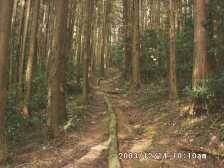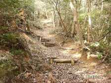 | 杉林をしばらく歩く | 今回のコース 九州自然歩道の看板のある(山頂まで1.7kmとある)大坂登山口から杉林を抜け、照葉樹の中を沢沿いに歩きます。水場を過ぎ、テーブルがある休憩場所で一息つき、急坂を行くと平坦となり(右手にロープ)「山頂まで800mの標識」のある谷間を渡ると右手に英彦山が樹木の間から見えてきます。さらに杉林の急坂を3分程度喘ぐと2つめの「水場」があり杉林を抜け呉登山口からの道との合流地点に着きます 赤土の急坂を一気に上るとアンテナが見え、山頂です。山頂では福智山方面が望めます。下山は、往路をとります。 今回のコースでは、約30種類の樹木に名札がつけられていました。樹木の名を勉強するには助かります。 |