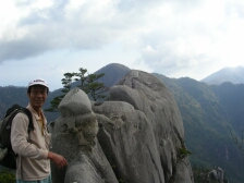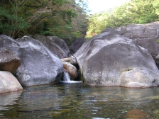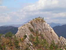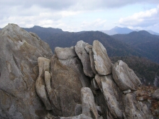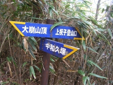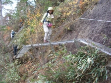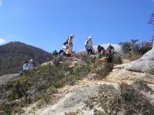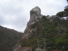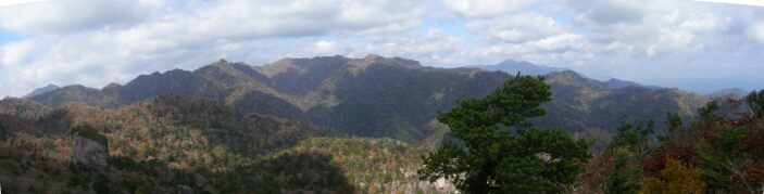 | 前ページからの続き 目の前はかって見たこともない岩峰が私を囲み、感動を呼びます。ふと足元をみると断崖絶壁でこれまたスリルがあってなんともいえません。記念撮影を済ませ、乳房岩を目指します。袖ダキ展望台より10分程度です。岩上に立つことができます。ここからはハシゴやロープが多く、全身を使っての山歩きとなります。急登を乳房岩から約30分行くと下湧塚です。さらに20分程度行くと中湧塚に着きます。ここでもピークに立ちます。岩の板が斜めに重なっているのが印象的です。ここから上湧塚を目指します。一旦下り、分岐点の標識まで行きます。ここから急登となり登りきると上湧塚です。標識から約20分です。目の前の巨岩をよじ登りピークに立ちます。展望は最高です。(写真下、パノラマ)展望を十分味わい、昼食をリンドウの丘ですることにします。今回、大崩山登頂は時間の関係上省略することになりました。勾配はないものの途中、滑りやすく歩きずらいところがあるので注意が必要です。上湧塚より約20分でリンドウの丘に着きます。ここで食事です。後から団体がこられて賑やかな食事となりました。食事を済ませ小積ダキを目指します。スズタケの中を歩き大崩山山頂との分岐を経て坊主尾根を歩きリンドウの丘から約30分で小積ダキの着きます。かなり広い岩の上です。南下方を見ると象の形に見える象岩を人がトラバースしているのが見えます。一旦来た道を戻り、象岩にへと下ります。恐怖のトラバースです。「カラビナで確保しましょう」と書かれています。特に何事もなく渡り終えました。下山はハシゴの連続です。林道との分岐点を経て祝子川の支流沿いに歩き、祝子川に出たら横断して大崩山荘に出ます。山荘からは往路と同じです。 <参考コースタイム> 登山口−(40分)−大崩山荘−(25分)−湧塚分岐点−(70分)−袖ダキ展望所−(10分)−乳房岩−(30分)−下湧塚−(20分)−中湧塚−(35分)−上湧塚−(20分)−リンドウの丘−(10分)−山頂分岐点−(20分)−小積ダキ−(130分)−大崩山荘−(30分)−登山口 ※休憩等の時間は含みません。あくまでも参考です。 朝6時に登山開始して午後3時過ぎに登山口に着きました。9時間以上の山行です。 山頂を目指すなら1.5時間以上は余分に見ておかないといけないようです。 <さいごに> とにかく素晴らしい山でした。遊山歩会の皆さんありがとうございました。 |