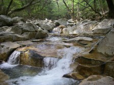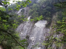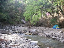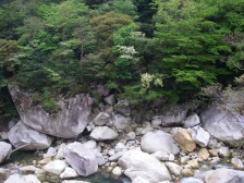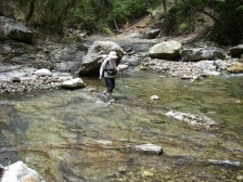 | 前ページから 登山道から河原に降りた場所が三里河原入り口の吐野(はきの・・・標識にはハクノ)です。ここで登山靴をスニーカー等に履き替え、川の中を歩きます。とても冷たく長い時間は無理です。右岸に行ったり左岸に行ったりしながらじゃぶじゃぶと水の中を歩いたりといつもと違う登山でした。河原は石ころからテーブル状の川床となりもちだ谷出合の滝がある場所に着きます。素晴らしい光景です。再び石ころの川床となります。さらに歩くと右手に支流がある中瀬松谷出合に着きます。左手が本流でしばらく行くと石ころがなくなり、巨岩が削られ滑らかな川床となります。さらに進むと右手に支流がある権七小屋谷合に着きます。このあたりがみどころとのことで今回はここまでで昼食をとり、帰路は往路を戻りました。 <参考コースタイム> 登山口−(30分)−大崩山荘−(20分)-湧塚分岐-(60分)−スラブ-(20)-吐野−(45分)-もちだ谷出合−(40分)−中瀬松谷出合−(30分)−権七小屋谷出合-(90分)-吐野-(70分)-湧塚分岐-(45分)-登山口 ※休憩時間は含んでいません。あくまでも参考時間です。全行程で約8時間30分でした。 <夏木山行き中止> 下山途中、雲行きが怪しくなり、美人の湯で天候を確認すると明日は朝から雨天のようだ。残念ではあるが、帰宅することにした。帰宅途中で夕食をすることになったが期待していた別府湾SAではファーストフードに変わっていたため、空腹にもめげず、高速を降りてずいぶん行ったところで、うどん屋さんに入った。んーうまかった。 <右岸と左岸> 谷を上流から下流に向かってみて右側が「右岸」、左側が「左岸」、下から見ると右が「左岸」、左が「右岸」となる。とても間違えやすい。 |