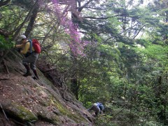 | ロープを頼りに降る | 上ワク塚下部で山頂登頂チームと一旦お別れ | リンドウの丘目指す(アケボノツツジだらけ) |