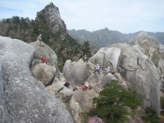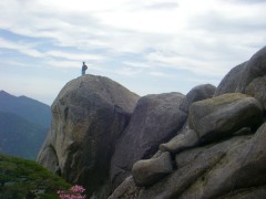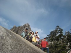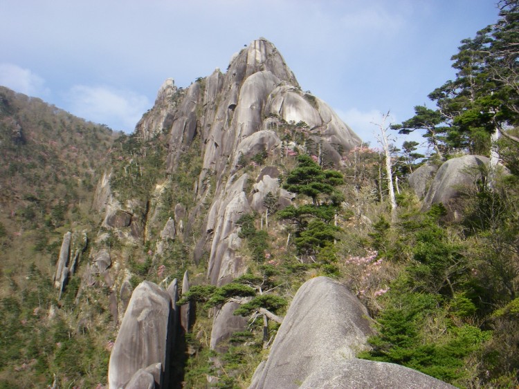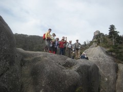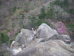 2010年5月5日 天気 晴れ GW3日目は、大崩山。昨夜は、杉ケ越から祝子川温泉へと移動し、温泉に浸かり、豪華な夕食とお酒を山仲間と供に味わいキャンプした。これも私にとっては大きな楽しみである。今朝は4時半に起床して5時半に駐車場を出発した。大崩山登山口までは2台で乗り合いをして移動し、5時45分に登山口を出発した。今日も天気は良さそうだ。 前日の傾山の日記へ <コース詳細> 登山口から祝子川(ほうりがわ)沿い緩やかな上りが続き30分程度で大崩山荘に着きます。さらに川沿いに歩くと岩壁をロープを頼りにトラバースし、ワク塚尾根と三里河原との分岐にでます。ここよりワク塚尾根へと向かいます。大きな石のゴロゴロとした川原に出ると金属製の橋がかかっていて一人ずつ慎重に渡ります。やがてアルミの梯子やロープ場があり、袖ダキへと昇り詰めます。袖ダキから目の前の小積ダキ(こづみ)を見るとその景観は何度見ても感動します。ここでしばらく撮影会です。次は乳房岩に立ち寄ります。一旦下って右に入り込むと乳房岩でここからの展望も見事です。展望を楽しんで下ワク塚を目指します。アルミの梯子、パイプの梯子とクリアして岩をよじ登ると下ワク塚です。さらに上の岩を目指します。行きどまりの岩峰が中ワク塚です。中ワク塚から一旦下り、縦走路に出ます。再び上りとなり上ワク塚に出ます。前回までは、北側の狭い岩壁の間と間を体を細くして上ったのですが、今回はロープもはずされていて新たに別の場所にロープが架けられていました。私はそれを知らず、巻道から往復しました。上ワク塚の頂上は素晴らしい展望です。七日廻りという奇岩峰やりんどの丘も眺めることができます。展望を楽しんだら岩場をロープを使って降り、ここで今回大崩山が初めての山ねずみさんとあこちゃんは山頂を目指すということでMORIさん夫妻が同行することにして信ちゃん夫妻と私たちはのんびりとりんどうの丘へ行くことにしました。次ページへ |