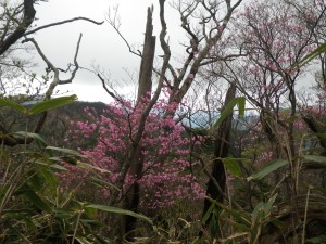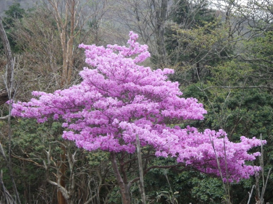 2012年5月4日(日)曇り ■出発時間:午前6時00分(宇土内登山口) ■メンバー:昨日と同じ GWの初日の昨日は諸塚山(前日へ戻る)を歩いた。そして今日は大崩山から鹿納山を歩く。そのため昨夜は、今日のため鹿川渓谷手前の休憩所にテントを張り、お酒も少々飲んでずいぶんと早く寝た。テントの中は少々暑いくらいでTシャツ1枚着てシュラフで寝れた。早く寝るとやっぱり寝飽きて早く起きてしまう。皆で簡単な朝食をしていると隣の車中泊していたご夫婦がMORIさんの知り合いと聞き驚く。(MORIさんの顔が広いこともあるが) さて鹿納山は、鹿納坊主とも言われとても面白い形の岩峰である。3年前に夏木山から五葉岳を縦走した際に見たときにぜひ登って見たいと思っていたので今日はとても楽しみである。6時ちょうど宇土内登山口に車を停め出発だ。車が通れないほど荒れた林道をしばらく歩くと左に小さな道標があって登山道の入り口とわかる。スズタケとブナの木の中、ミツバツツジの花がまず出迎えてくれる。自分の呼吸の音が激しくなるのを感じながら高度を上げて行くとアケボノツツジの花がたくさん咲いていて心地よい風が急に肌寒くなり、背まであったスズタケはなくなり尾根は狭くなってきた。アセビのトンネルを抜けると鹿納山への分岐を見て稜線に出たようで平坦になる。7時50分、湧塚やモチダ谷コースからの合流点に着く。合流点には大きなザックが3つ置いてある。。おそらく大崩山の頂上を目指して歩いているのだろう。私たちも背の高さを超えるスズタケの中稜線を歩き山頂を目指す。しばらく行くと反対から3人のパーテイが歩いてきた。さきほどのザックの持ち主だ。昨夜はりんどうの丘でキャンプだったそうだ。稜線沿いのアケボノツツジは未だ蕾が多くこれからも楽しめそうだ。急に開けると岩場に出る。石塚と言われる場所だ。展望が良いはずだが、ガスって何も見えない。再びスズタケの中を歩き8時5分、山頂に着く。未だガスが抜けない。しばらく休憩して往路を戻る。合流地点に戻ると5〜6人のパーテイに会う。そこで話をしていると昨夜のキャンプ地で今朝お会いしたMORIさんの知り合いのご夫婦に再びお会いし、記念に写真を撮ってもらう。どうやら同じルートの計画のようだ。鹿納山への分岐地点まで戻り、鹿納山を目指す。しばらく広い尾根を降るが、この辺りの景観がとても良い。ブナなどの巨木も多い。アップダウンをしながら1457mピーク辺りに着く。さらに進み10時30分下山に使うコースとの分岐に出る。ちょうど鹿納山の稜線に出た感じだ。ここからは狭い尾根道である。ガスもずいぶんと抜けて鹿納山の別名鹿納坊主が姿をはっきりと近くに現す。岩のヤセ尾根を歩き何度かスズタケのトンネルを漕いで広場に飛び出る。権七小屋谷からの合流点でもある広場は、ランチをするにはもってこいだ。小休憩をして鹿納坊主を目の前のに左に巻いて近づく。降りの登山者を待ち、いよいよ岩を登る。高さは大したことはないが、落石しやすく滑りやすい。岩をつかんで三点支持で登り上げ、11時15分登頂。360度の展望だが、狭く風も強いし後続の登山者のためにも少々心残りだが写真だけ撮ってさっさと降る。そして広場まで戻り、ランチタイム。私の昼食は、今朝沸かしたテルモスの湯でインスタントの玉子スープを作り、パンを食べる。腹は減ったようだが、途中で奥様方から菓子などをいただいたのでそんなに食べれない。広場から往路を分岐地点まで戻る。12時35分、分岐から西へと降る。やっぱりスズタケが多いがアケボノツツジの花も多い。13時20分、尾根の分岐から約45分で川原に出た。 次ページへ |