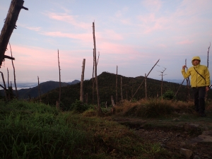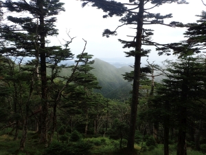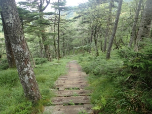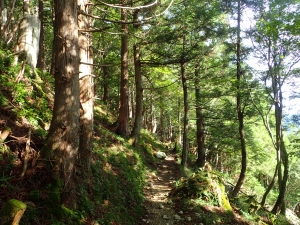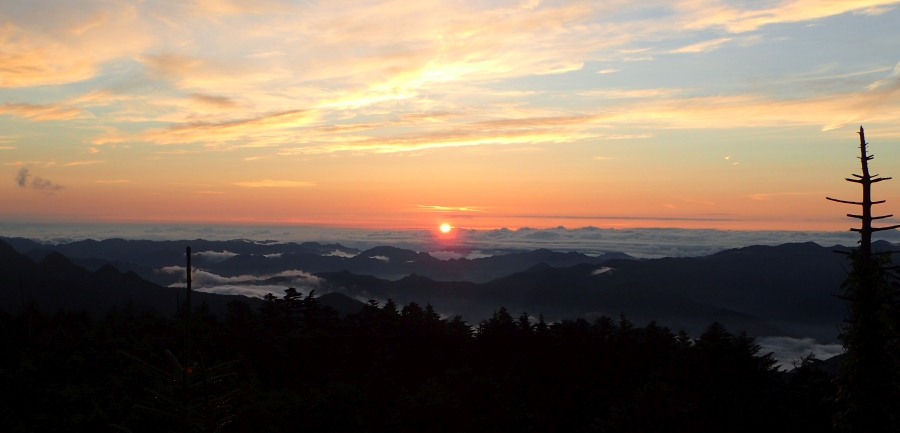 | 前ページからの続き 昨夜は雨が降っていたが、午前3時くらいには満天の星を見ることができた。 午前4時20分、ぐっすりと寝れたようで朝焼けを見てご来光を拝もうと起きることにした。 弥山頂上でしばらく待つと小さく丸い太陽が出てきた。両手を合わせ感謝の気持ちを伝えるのである。何しろ太陽があっての地球だから。 朝食も一人で食べる。管理人さんには何だか申し訳なく思う。 弥山小屋にお別れを告げ、下山開始である。と言っても今日の道のりはかなり長い。 さっきまで空は雲がなかったが、いつのまにかガスで覆われてきた。 長い木の階段は濡れていて滑りやすいので慎重に歩く。反対から若い登山者が歩いてきた。きっと狼平小屋で一泊したのであろう。この辺りはオオヤマレンゲの群生地らしいが、どれがその木なのかわからない。 狼平小屋はとてもきれいだ。ロフトもあるので狭いが結構寝れそうである。 鉄の吊り橋を渡り、上り道を歩く。平坦になってレンゲ道との合流点に出たので少し、探索がてらに寄り道をする。 再び、縦走路を歩き栃尾辻に着く。ここから坪内へ降りて温泉に入ろうと思ったが、通行禁止になっているのでそのまま天川川合へと下山する。 尾根は細くなり遭難碑を見ると林道に出る。すぐに登山道に入り、杉林の尾根をどんどん高度を落とす。 民家に出るとそこが登山口のようだ。特に派手な標識はもちろんない。 吊り橋を渡り、観光案内所に到着。トイレを借りて着替をする。 温泉に入れなかったのがとても残念だ。 ちょうど良いタイミングでバスが来たので乗車し、下市口駅で降りてコンビニでビールを買い、駅に行くとちょうど特急電車が来たので乗り込む。何と時間の無駄がない。 新大阪で遅い昼食をとり、無事帰宅。 少々寂しいかったが、静かで自然を満喫できた山行だった。今回も自然に山にそして地元の人に感謝!! ■コースタイム 初日: 行者還トンネル西口-(60分)-奥駈道出合-(55分)-聖宝理源大師の像-(50分)-弥山小屋-(25分)-八経ケ岳-(25分)-弥山小屋※休憩時間含まず。全行程で約4.5時間でした。距離6.5km標高差869m 二日目: 弥山小屋-(60分)-狼平-(20分)-高崎横手出合-(50分)-金引橋分岐-(30分)-栃尾辻-(40分)- 林道-(75分)-民家-(6分)-天川川合 ※休憩時間は含まず.全行程で約6時間。距離13.1km 標高差1280m |