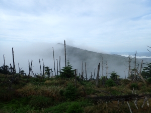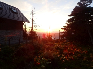 | 弥山小屋に陽が差す | 弥山小屋を出発(6:15) | ガスに覆われ始めた八経ケ岳 |