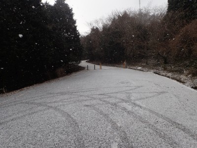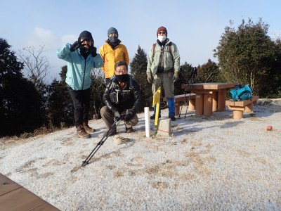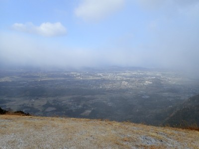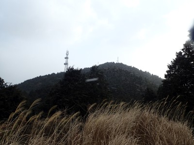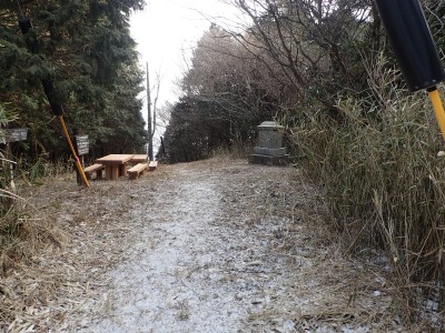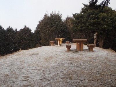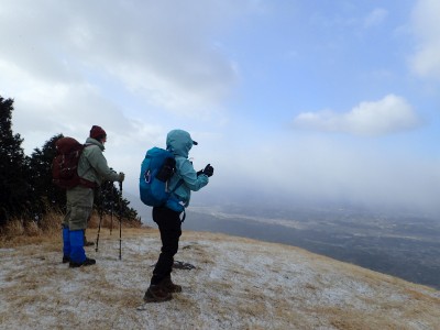 さて今回の縦走は2台の車輌が必要だが、健脚の人は道の駅香春から大坂山まで九州自然歩道を歩ける。軟弱な我々は車を1台デポする。道の駅香春の駐車場はあまり広いとは言えないので登山者は遠慮して上(山手)の駐車場に停めるのが良い。大坂山の車道終点場所も邪魔にならないように十分配慮して停めよう。 今日は雪模様で仲哀トンネル手前からこの舗装道が凍結していれば、初めての冬用タイヤの効果を試せるが、うっすらと積もっただけで少々期待外れであった。車を停め降りると猛烈に寒い。風も強く気温も低いようで悴む指で靴紐を結んだが、しばらくは指の先がしびれたように痛さを感じた。手を擦りながら大坂山を通過し、薬師頭へ。薄い雲と青空と・・・・なんとも言えない眺めだ。再び大坂山頂上で記念写真を撮っていよいよ縦走が始まる。
