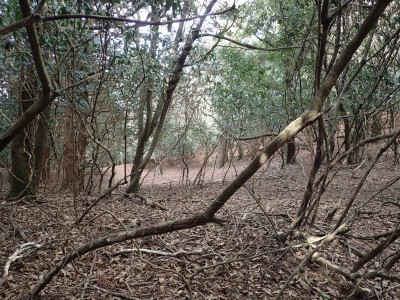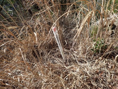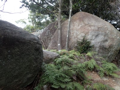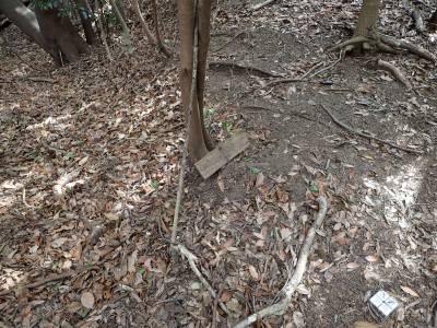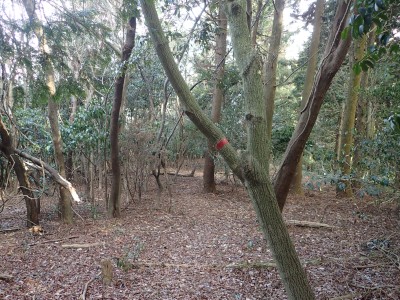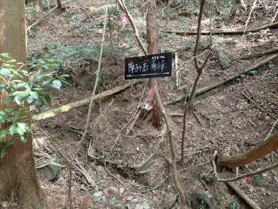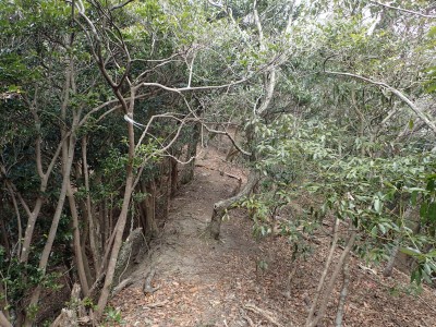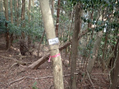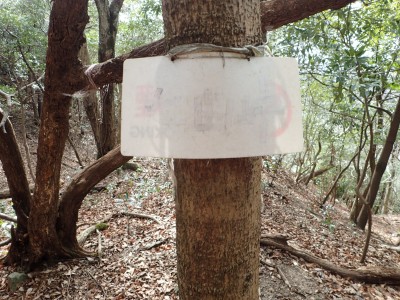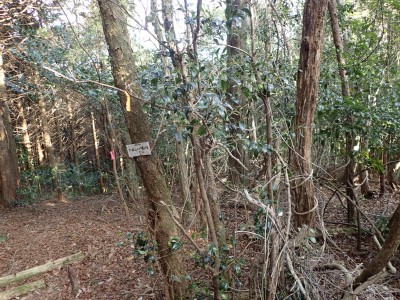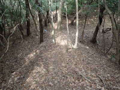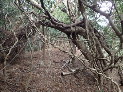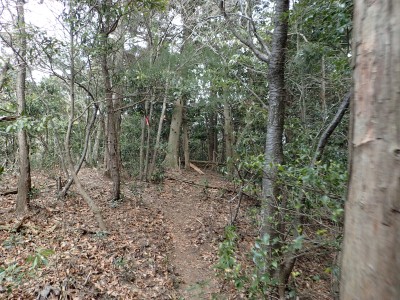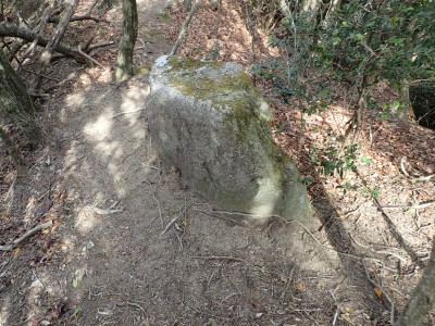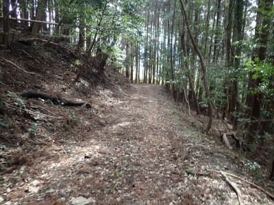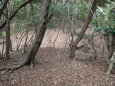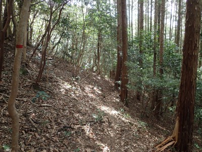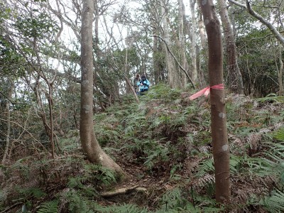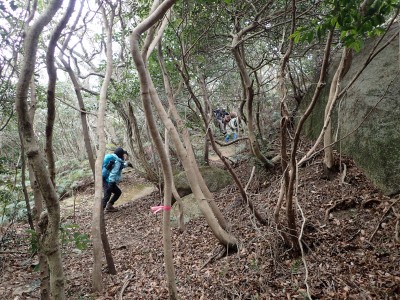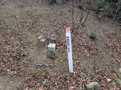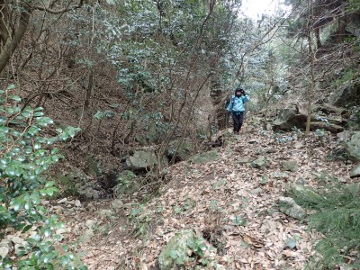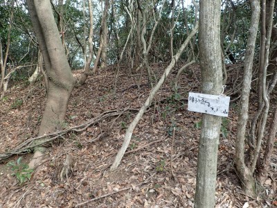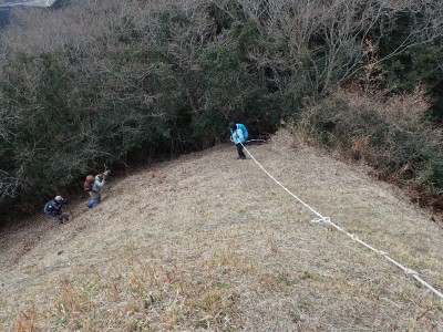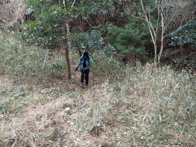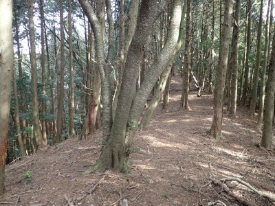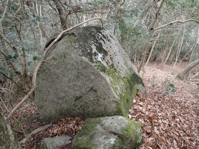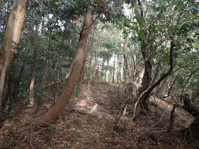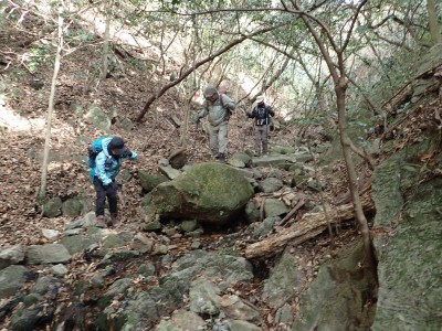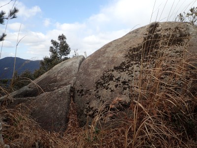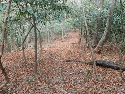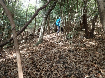 呉登山口から大坂山への自然歩道を降るが、当然ながら整備された明確な登山道である。しかし途中から踏み跡があるだけで道はない。木にぶら下がった案内に「障子ヶ岳(悪路)」とある。悪路なら未だ「道」だが、道はない。森林の中を地図を見ながら進む。仲哀越を過ぎ、点在した石が現れると三角点のある巨石で展望の良い場所だ。七曲峠から登り返すと障子ヶ岳南峰と書かれた表示板がある。さらに進むとテラスに出る。ここから障子ヶ岳がよく見える。鞍部に降ると石鍋越で他のSNSの地図では鍋石越となっているが前回歩いた時に小さな木の板に「石鍋越」と書かれていた。どちらが正しいのか・・・・。下山はここまで戻って谷を西に降る予定だ。鞍部で休憩してここから急登だ。枯葉が乾燥して滑りやすくズルズルとしながら森を抜けると正面にドカンと干し草を盛ったような山壁にぶつかる。ロープがかかっている場所からよじ登ると障子ヶ岳頂上、広い台地は城跡だとすぐにわかる。先客の若いご夫婦は味見公園から来られた地元の方だそうでこれからも山が好きになってほしいと願う。