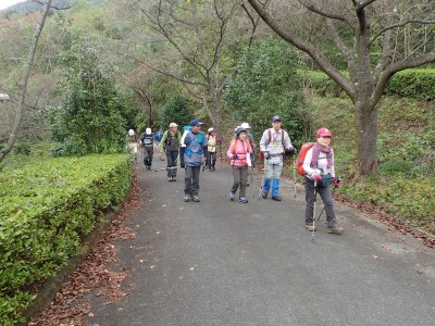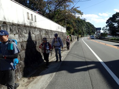 ここからスタート地点まで車道の路側帯を一列に並んで歩く。