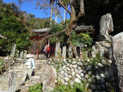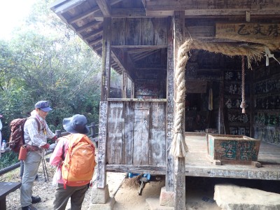 山頂から往路との分岐点でガイドさんお二人と別れを告げ、乙文殊院へと降る。樹林帯が続く尾根から谷間へと進む。 たもと石が見えてくるとその下にお堂がある。別名「落書き堂」と言われる落書きだらけの「乙文殊院上宮」である。(「もいっさん」とも呼ばれてるそうだ)知恵の神様で合格祈願の参拝者が屋根近くまで落書きしている。脚立でも持参したのか・・・・・
