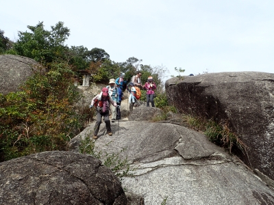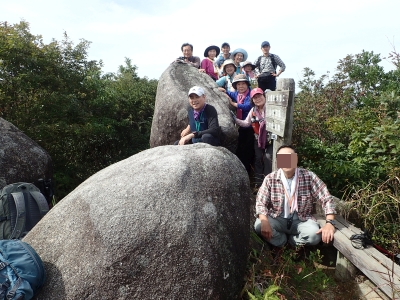 山頂は開けているが狭いので長居はできない。集合写真を撮ったらさっさっと降りて上宮でランチタイムとした。登山者は、ぼちぼちとやってくる。人気はあるようだ。