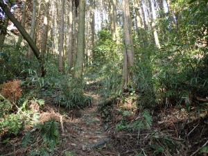 | 自然林と植林帯の境目 | 「曲輪(くるわ)」とある | 「土橋」とある |