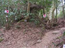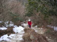 「天の泉」を過ぎ頭巾山分岐より約20分でレーダードームが目の前に現れ右手に回り込むと舗装道に出ます。ゲートの横より回りこみひとのぼりすると三郡山山頂です。山頂からの展望は抜群ですが、どうもドームなどが目に付き景色が損なわれます。ここで食事をとり来た道を折り返します。ここから若杉山方面「つき谷コース」で昭和の森へ下ることもできるようですが、工事中で通行止めのようです。難所ケ滝から登りつめた分岐(河原谷コースとの分岐)まで戻り、さらに宝満山へ向け尾根道を行きます。この分岐から約1kmで宝満山です。「長崎鼻」と言う巨岩を通り過ぎ三郡山山頂から約60分で仏頂山山頂に到着です。 すぐ先に「うさぎ道」との分岐があります。帰路はこの道より下山します。そのまま宝満山へ向かい、大きな岩が見えるとそこが宝満山です。仏頂山から15分で宝満山山頂です。 復路は、「うさぎ道」の分岐まで戻り、ここから「うさぎ道」に入ります。こちらはあまり人気のない道らしく積雪の日は迷うかもしれませんので復路も往路を使うほうが良さそうです。 うさぎ道をどんどん下ると途中「難所ケ滝60分」と分岐の標識がありますが真っ直ぐ下ります。やがて「かまど神社⇔河原谷・昭和の森」と書かれた標識がありますので右手に行きます。15分で往路で歩いた道と合流します。ここから約45分で昭和の森です。 |