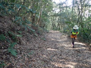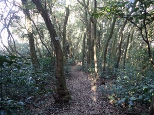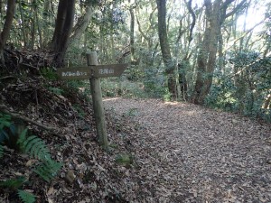 | 帆柱の辻からの道と合流 | 広い道を歩く | 「照葉樹の森」とある |