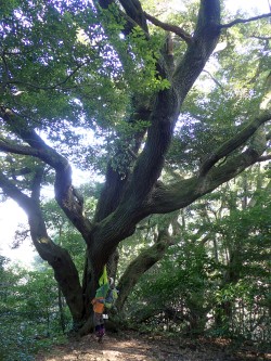 | 前ページから 権現山の頂上から再び舗装道を歩き、帆柱山への分岐道標から登山道へ入る。 この辺りから巨樹を楽しめる。権現ノ辻と言う場所には皇后杉の説明板がある。 それには「この辺りおよそ4ヘクタールにわたって林立する老杉を総称して皇后杉と呼ぶ」と書かれている。今回の目的である皇后杉を満喫して今度は帆柱山へと歩を進める。 道は整備され歩きやすい、帆柱ノ辻からそのまま緩やかな坂を歩き、樹林帯の中の帆柱山頂上に着く。わずかに西側が開けているだけで展望はあまり良くない。しかし、落ち着く雰囲気をかもし出している。 帆柱ノ辻を過ぎて花尾山への分岐まで戻り、分岐から尾根道を降ってT字路を左に谷間へと降る。帆柱ノ辻からの道と合流し、Y字路の花尾ノ辻へと降る。 ここから花尾山へは10分とある。花尾山は城跡なのでそれらの遺構が見られる。 左回りで山頂に立つ。パノラマには、洞海湾を挟んで若松が島のように見える。その手前はやはり工業都市らしく景色が広がる。最近ではこの工場群の夜景ツアーが人気らしい。 花尾山から花尾ノ辻まで戻り、山麓駅へと下山する。途中、権現の泉と言う水場があって車道に出るとそこが花尾分かれと言うらしい。ちょうどそこは四合目と書かれた標識がある。そこからはひたすら車道を歩き、ふれあいの家から往路を戻る。 次回はぜひ、違うコースで歩いてみたいと思う。そんな余韻を残した山行だった。 今日も山に自然に感謝!! ■コースタイム 山麓駅P-(30分)-ふれあいの家-(50分)-皿倉平-(15分)-皿倉山頂-(10分)-皿倉平-(20分)-権現山頂上-(5分)-登山道入口-(10分)-権現ノ辻-(10分)-帆柱ノ辻-(15分)帆柱山頂上-(10分)--花尾山への分岐-(18分)-花尾ノ辻-(12分)-花尾山頂上-(10分)-花尾ノ辻-(12分)-花尾分かれ-(15分)-ふれあいの家-(18分)-山麓駅P※休憩時間含まず。全行程で5.5時間でした。距離14.4km 標高差515m |