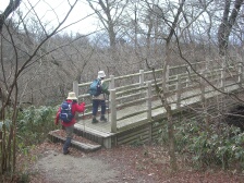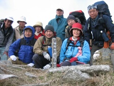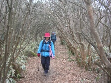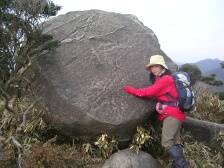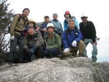 | 2007年2月24日(日)曇りのち晴れ 遊山歩の2月度例会はメンバーのシュー左衛門さんの快気祝いを兼ね、脊振・金山縦走となった。参加者はシュー左衛門、MORIさん夫婦、さこちゃん夫婦、しんでんさん、がしんさんと私たち夫婦の9名で2台の車に相乗りして行くことになった。 鞍手SAに7時集合し、登山口に着いたのは8時30分であった。 <アクセス> 長崎道は東脊振I.Cで下車、国道385号線を福岡面へ。東脊振トンネル(有料普通車300円)を抜け、数百メートル先を左折(T字路)背振雷山県立自然公園方面へ。同公園を過ぎ板屋学園を右に見て少し行くと左に自衛隊の分屯基地への道があるので左折して進む。車道をとにかく進むと山頂下の駐車場に出る。 <今回のコース詳細> 今回は脊振山の山頂まで車で乗り入れました。上宮では氷が張っていて寒さを感じます。 いちよう登頂したことにして駐車場に戻ります。標識がありますので椎原峠をまず目指します。公園のように整備された道を歩き、舗装道を横断したら展望台の標識があります。高いところが好きな人だけ展望台に立ち、再び舗装道へ出ます。矢筈峠(標識がない?)を過ぎ左手に九州自然歩道の標識があるのでここより登山道へと入ります。途中、「太鼓岩」への分岐がありますが、20分程下らんないといけないようなので(かなり急勾配)今回は立ち寄らずに進みます。道は下り坂で急に開けた場所に出ます。白い砂地のようなところで不思議な気がします。標識のとおり右手に進みます。シャラの木などの自然林をしばらく歩き「唐人の舞」の標識があるので立ち寄ります。唐人が岩の上で舞ったといわれているようです。従走路に戻り、ミヤコザサの道を行きます。赤松の林を抜け下りきったところが椎原峠です。休憩をしてしばらく平坦な道を行くと大きな案内板がある井手野との分岐にでます。舗装道があるので車はここまでこれそうです。道は急登となり林の中を抜け尾根に出ると鬼ケ鼻岩への分岐点に出ます。右が鬼ケ鼻岩で左に行くと金山ですが、もちろん鬼ケ鼻岩に立ち寄ります。約2年前に金山に来たときは椎原からこの鬼ケ鼻岩に出ました。 次ページへ |