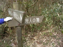 | シャラの木等の自然林を歩く | 唐人の舞との分岐 | 唐人がこの岩の上で舞ったという |