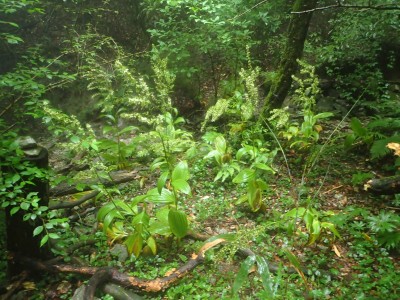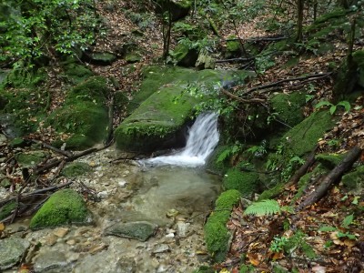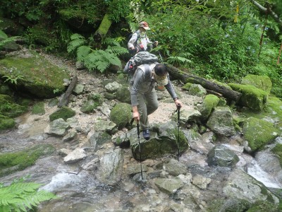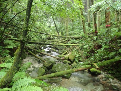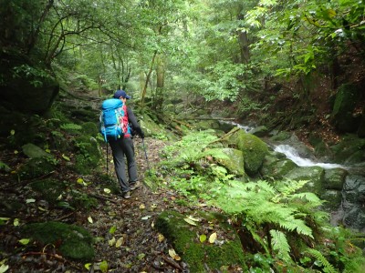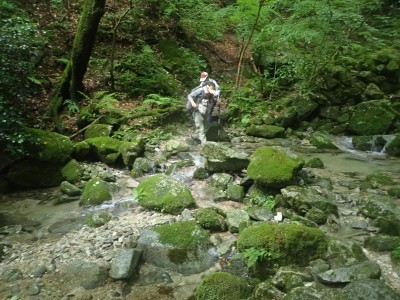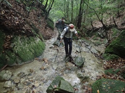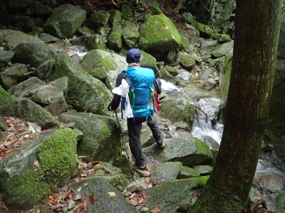 椎原峠は脊振山から金山への縦走路にある。ここから脊振山まで長い道のりだ。しかも笹で覆われて変化がないので少々飽きる。こんな時は仲間との馬鹿話が一番だ。唐人乃舞に着くとそこは風が強く、寒くてすぐに撤退する。再び縦走路に戻り開けたザレ場に出る。そこからすぐに車道に出て下山に使う車谷への入口である矢筈峠をみて車道をひたすら歩く。ゲートを出ると遊歩道があるので脊振山の駐車場まで森の中を歩く。あとでここで昼食しようと東屋を見て駐車場出るとKさんが朝から楽しみに話していた自動販売機があった。山頂を往復してその自販機でKさんとHさんはコーラーを購入。確かに炭酸を喉に流し込む爽快感はなんとも言えない。東屋で昼食を済ませ下山は車道を矢筈峠まで歩く。結構この車道歩きが長いので正直疲れる。矢筈峠から車谷へと降る。こちらは完全に沢沿いで何度も徒渉をする。途中で「ロープを使った徒渉の練習」をした。いざというときの訓練とも言えるが今日のメンバーでの方法についての確認でもある。
