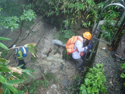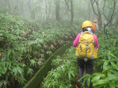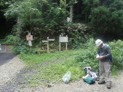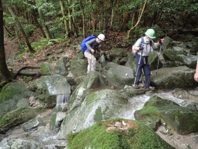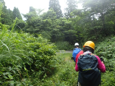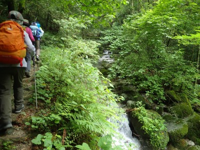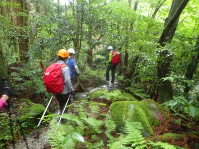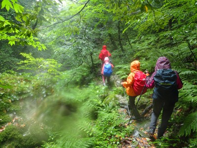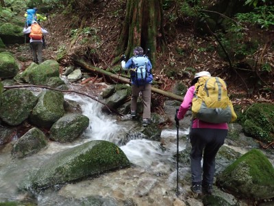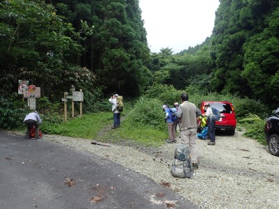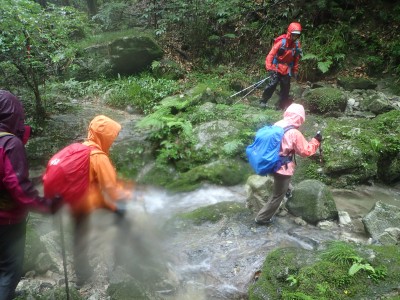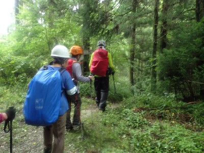 前日、天気予報は「曇り」。雨だと中止の予定であったが決行だ。この時期は、突然の雨で沢は増水し、危険な状態になる。今回は行きも帰りも谷ルートだ。特に車谷は徒渉箇所も多く、沢沿いに歩くため増水で進路を絶たれかねない。そのためロープなどを準備していた。また、車谷の降りは、石の上を歩く場所が多く滑るのでヘルメット着用をして完全装備の準備をしていた。