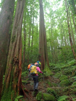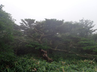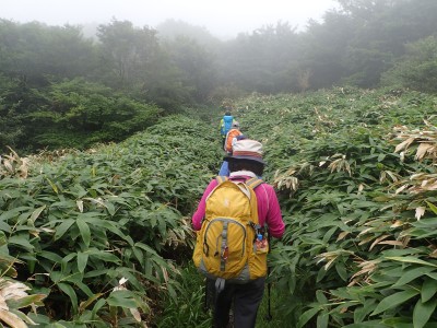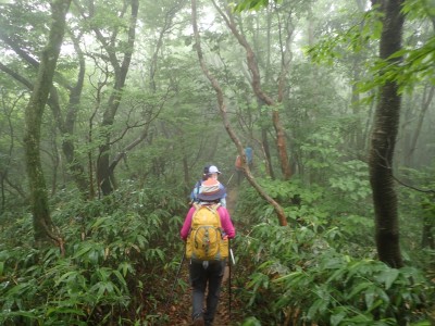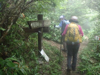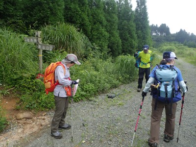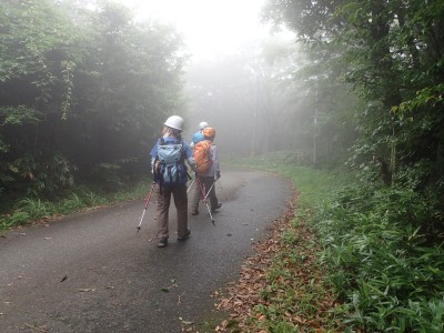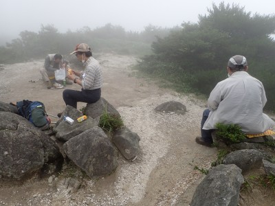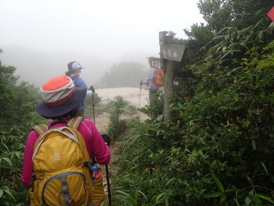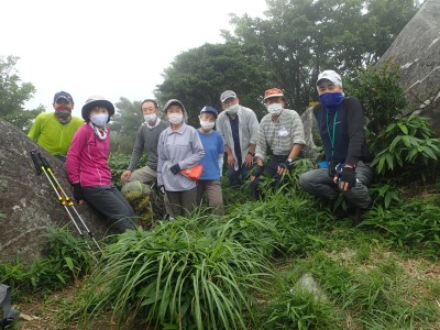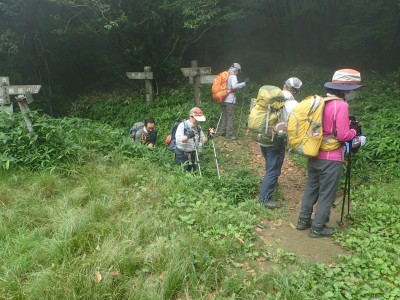 7月5日に4名で下見をしたばかりだが、本番である今日の参加者は8名でその内の半数は今月2回目の同じルートを歩くことになる。下見ではあいにくガスに覆われて唐人乃舞や脊振山頂上での眺望は楽しめなかった。下見に参加したメンバーにとっては、せめて天候が良く眺望が楽しめればと思ったが残念なことに前回と同じような天候となった。そしてもうひとつ期待していたことがあった。それは車谷でのキツネノカミソリの開花だ。ところが少々早かったのか、それとも絶滅したのか、一輪もみつけることができなかった。