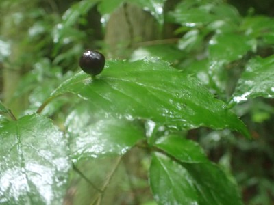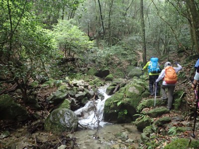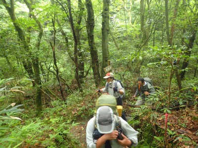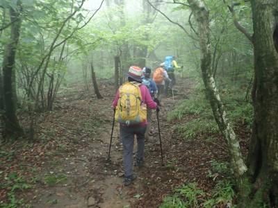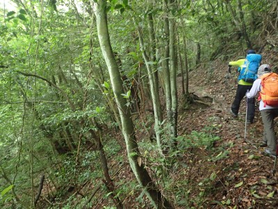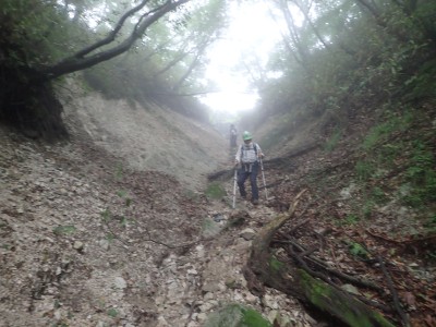 唐人乃舞からザレ場に到着したときに雨雲レーダをスマホで見た。何と水色の中にオレンジ色がある雨雲が近づいている。ランチはゆっくりできずに早々に降ることに。案の定、途中で雨が降り出した。 それなりに準備していたから慌てることはないが、ゲリラ豪雨になったらどうしょうもない。とにかく慌てずゆっくり急いで下山。幸い荒れた林道に出る時には止んでくれたので皆ほっとしたようだが、ロープを使わずに済んだことが少し残念に思った私の気持ちは内緒にしておこう。