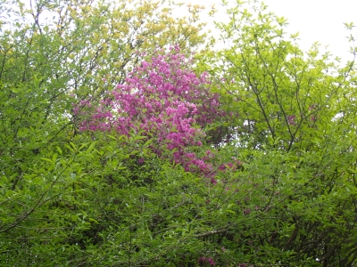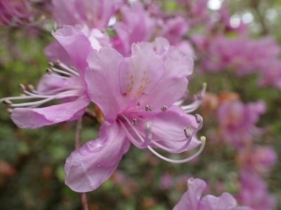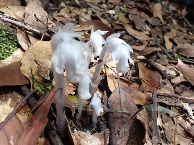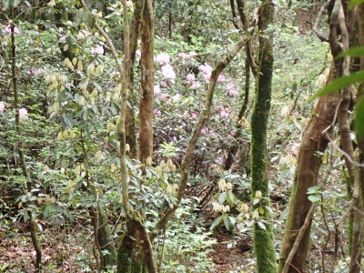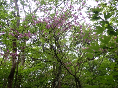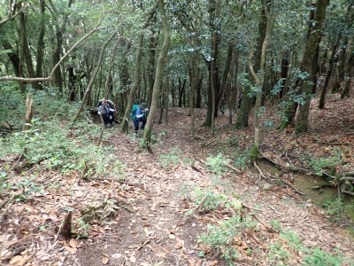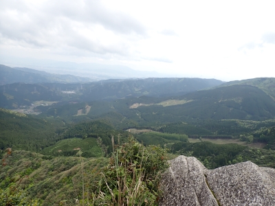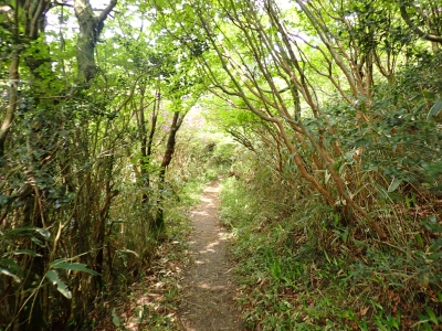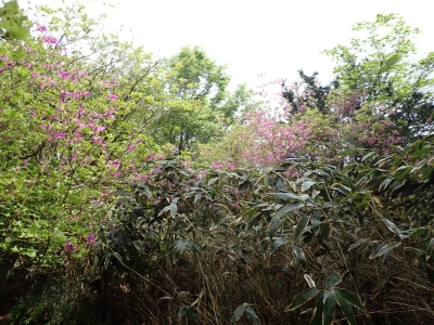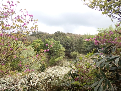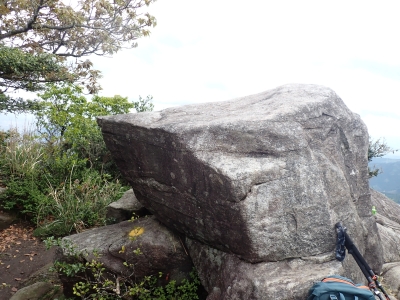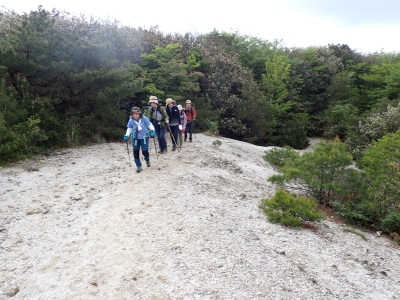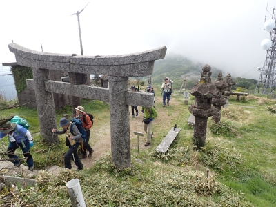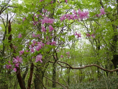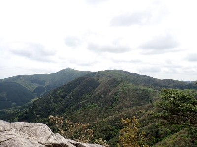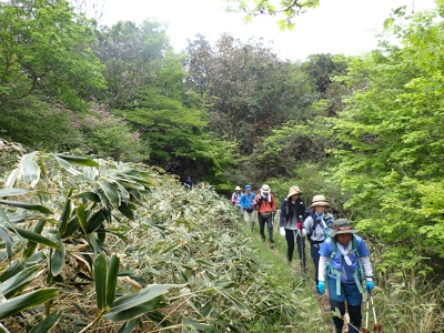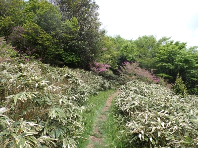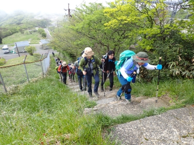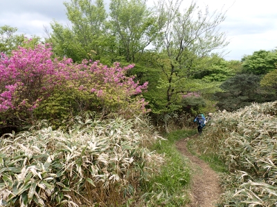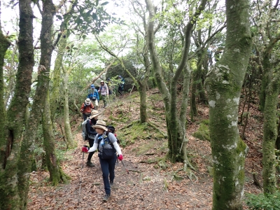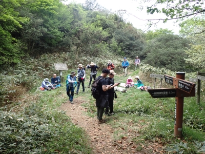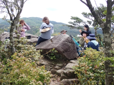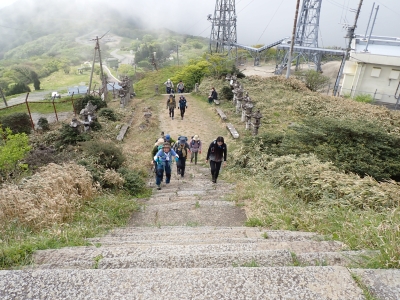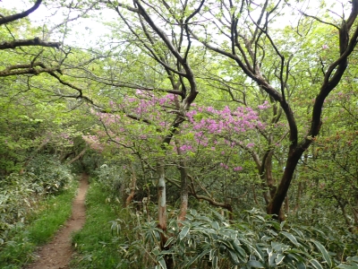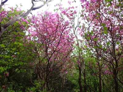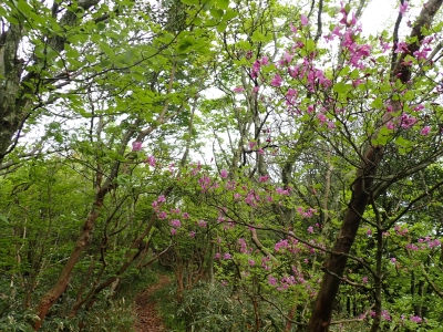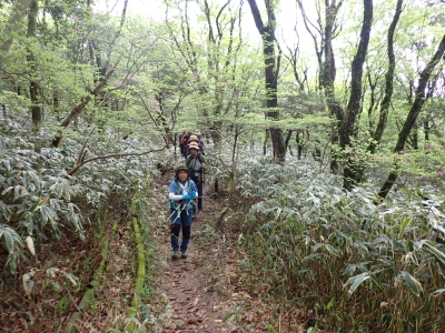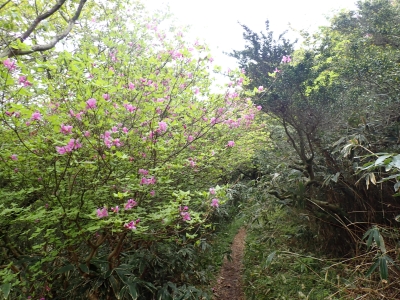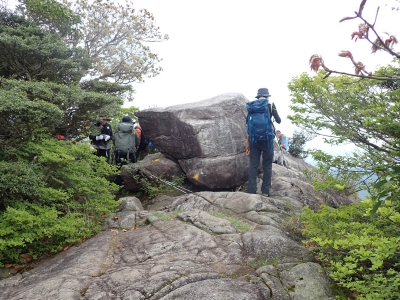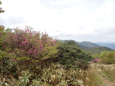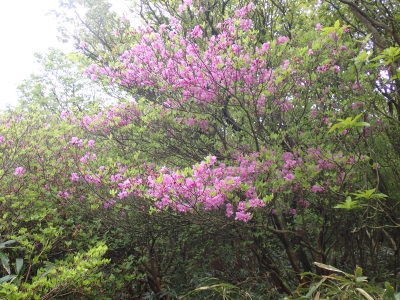 今回のコースは、脊振山頂上から約60m下の駐車場から歩く。従って標高差はあまりない。天気もまずまずだが、ガスが広がって視界はあまり良くない。まずは標高差60mを登る。と言っても石段はきつい。頂上は北側以外はガスって見えないが、絶景を楽しめた。石段を戻って車道をしばらく歩き、椎原峠への分岐に入る。ここにはキャンプ場を抜けて駐車場へ戻れる登山口があるが、現在、道が崩れて通行止めとなっていた。舗装道が続き、矢筈峠を通過すると左手斜めに登山道があるので入り込む。雑木林のきれいな樹林の中を進む。もちろん目当てのコバノミツバツツジは、よく咲いている。唐人の舞は今日の目的地なのでここで集合写真を撮り、再び縦走路を行く。ミツバツツジの花が続く。椎原峠で折り返すことも考えていたが、メンバーから「まだ先まで行けるよ」との声もあり、計画通り鬼ケ鼻岩まで行くことにした。多くの登山者とすれ違い、きれいな縦走路を楽しみながら歩く。最終目的地の鬼ケ鼻岩に着くと多くの先客が岩上で展望を楽しんでいた。ランチをしている他のグループが、早々に場所を譲ってくれた。東側の岩上からは脊振山のレーダドームがよく見える。ここまで歩いてきた稜線が達成感をくれた。ゆったりとランチタイムを過ごし、下山は往路を戻る。風景は変わらないがミツバツツジの花の色がなぜか濃く感じた。