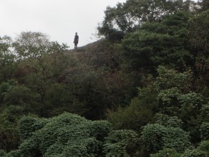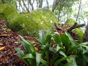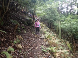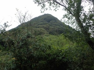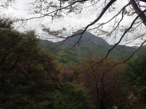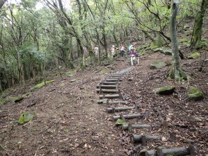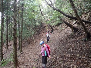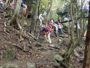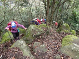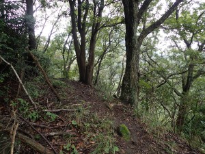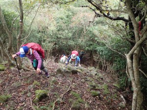 平成28年10月23日(日) 天気 雨のち曇り ■出発時間:午前6時30分(小倉南区葛原) 東九州道は宇佐I.Cで降りる。帰路は道の駅なかつを経由し、上毛I.Cから高速道。 ■メンバー:女性7名、男性5名 予定では宮崎県の行縢山(むかばきやま)を歩く予定だったが天気予報は雷雨&豪雨。 集合場所で別の山に変更することを伝える。幸い国東方面は曇りの予報だった。 3台の車で登山口目指す。不動口から下山口である赤根登山口に車をデポする。 雨は止んでいるが今にも降りそうなので雨具の上着だけ着る。シャツだけでは少々寒いのでちょうど良い。千灯寺跡地、奥ノ院、五輪塔群と山岳宗教の遺跡巡りとも言える山行は不動山で終わりだ。不動山直下には、国東半島アートプロジェクトの事業として人体を型で造った像が設置されていた。遠くから見ると本当に人が立っているように見える。少々不気味ではあるが、作成の過程や設置の模様を知るととても温かさを感じる。 不動山から千灯岳への縦走路は通常の登山道となって雰囲気がまるで変わる。 鹿ネット沿いに緩やかな道を進み舗装道に出る。小さな粒の雨が白い空から降っている。 ここで昼食をと思ったが、少し登山道を進んでみることに。それが正解ですぐに樹林の中にベンチがある場所があったのでここで昼食とした。 昼食を終え、リュックは軽くなったが、身体は重くなった。これからきつい登りが始まる。 「形の良い山は、きつい」である。高度を上げて行くとまたまた雰囲気が変わる。苔むした石と樹で緑一色だ。と言っても濃淡があるのでとてもきれいである。これこそ自然が造りだしたアートでないか・・・。山頂に着くと、以前訪れた時よりも広く感じる。きっと草や樹が茂っていたのではないだろうか。 下山は、あかねの郷側へと降る。もちろん急斜面だ。途中で鹿が逃げて行ったが良く鳴いていた。今日も自然に山に仲間に地元の人に感謝!! ■コースタイム 不動口-(35分)-旧千灯寺跡-(35分)-茶店-(20分)-五辻不動尊-(45分)-林道-(60分)千灯岳頂上-(65分)-あかね登山口※休憩時間含まず。全行程で約5時間でした。標高差539m |