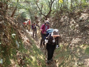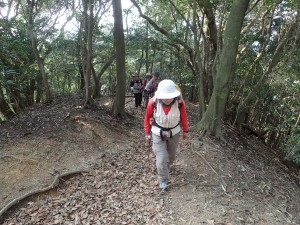 平成30年3月25日(日)天気晴れ ■出発時間:8時30分 自宅 ■メンバー:男性1名、女性6名 アタック山の会の3月例会は、何と男が私だけになった。参加者からは「皆、どうしたの?」と聞かれるがそれぞれ理由があるとしか言いようがない。まさか、皆で示しあわせて私一人だけにしたとは思えないし、思いたくもない。しかし、普通なら女性ばかりだから「モテていいじゃない」となるのだが、何しろお姉さんばかりで・・・・・・・。 さて、この時期はなんと言っても「桜」だ。昨年私と家内で四王寺山を歩いた(過去の日記)が、岩屋城跡の多くの立派な桜の木が記憶に残っていて咲いていればきっと皆喜んでくれるだろうと計画した。 駐車場に着くと未だ咲き始めの桜が結構たくさんある。花がないときは、気がつかなかったが、政府町跡の周りは桜の木がたくさんある。今日の午後はきっと花見客で賑わうだろうと思いながら歩き出す。 車道を歩いているとご夫婦らしき人が何か向かって写真を撮っている。メンバーの一人が「キジですよ」と言うのでそっと近づくと何とキジの雄が1羽じっとしているではないか。全員が集まってしばらく眺めるが、慣れているのか逃げようとしない。登山口から尾根にとりつくと落ち葉のフカフカした道が続く。土塁と思われるえぐれた道は山腹を巻いている合流点まで続く。 大城山から音楽堂へ降り、さらに百間石垣へと降る。途中の草原で昼食を済ませ、石垣に出ると観光目的の人が、たくさんいて気分はハイキングだ。 小さなアップダウンを繰り返し、大原山、焼米ケ原と周回する。今日の一番の見所である の桜は未だ5分咲きだが、それでも高台の花見はいいもんだ。後は、まっすぐとスタート地点へと降る。予想通り花見の人で賑やかだ。今日も自然に山に皆に感謝!! ■歩行距離等: 距離12.0km 標高差408m 全行程で約6時間 |