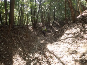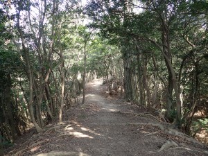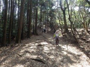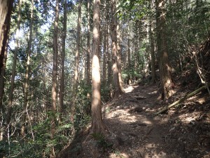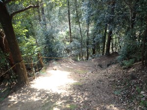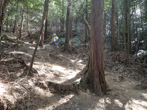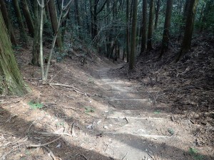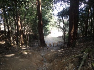 | ここまで戻り左の広場の先から降る | 階段状になっている | 杉林の中を降る |