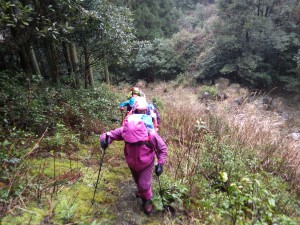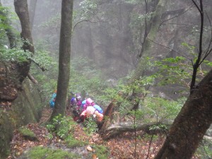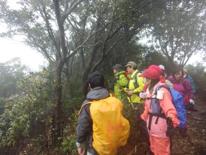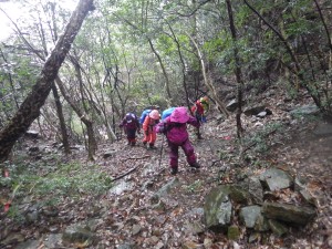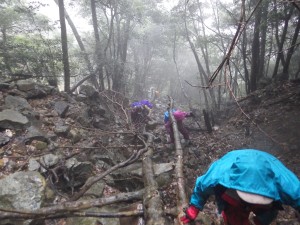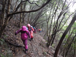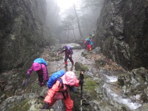 平成27年2月22日(日) 天気 雨 ■出発時間:午前7時00分(小倉南区葛原) ■メンバー:男性5名 女性5名 計10名 氷瀑のゴルジュを満喫するはずの予定であったが、あいにくの雨である。年間山行計画を立てるとどうしても空振りになることが多々ある。 雪や霧氷、お目当ての花の開花時期などどうしても天候で左右される。 自然を楽しむのが目的なので全く仕方がないことなのだが・・・・・ アッタク山の会は基本的に雨天決行である。雨天ならでは楽しみは多少あるもののやはりつらいことが多い。登山道は滑りやすく転ぶと泥だらけになってしまう。山頂に立って展望を楽しむこともない。鳥の囀りは、雨の音で聞こえず。岩の上も滑りやすい。 しかし、このような日に歩いていると突然天候が変わった時などはそう慌てることもない。 このメンバーはそれを十分理解しているので雨の日でも楽しむことを知っている。頼もしい限りである。参加予定のメンバーからキャンセルする人は一人もなかったのはとても嬉しいことである。 さて今回は、雨で増水すると大変危険な場所である。沢登りの経験はないし、装備などもちろんない。雨の降り加減によってはコースの変更も考えなければならない。 中山神社から古堂橋までの谷間は途中で登山道が不明瞭で林道直前で道を失い適当に登った。林道から再び登山道に入るが、雨で滑りやすく歩きづらい。ゴルジュの入り口にくると増水はさほどしておらず、これなら行けると大きな石を超えて進む。前回歩いた時は何のことはなかった岩場が今日はとても滑りやすくとても緊張した場面が続く。 前回歩いた時に見た氷瀑は当然ながら全く姿をみれずというか通過するまでそれどころではなかったのが正直なところだ。 全員無事通過して平坦な場所に出たらひとまず安心。山頂を目指し進む。 再び林道に出るとゴォーと音がする。飛行機の音だろうと思っていたが、鳴りやまないのでどうも違う。誰かが風力発電ではないかと言う。樹林帯の急斜面が終わると少し下ったり上ったりしながら舗装道に出ると風車内立ち入り禁止の立看板がある。やはり風力発電である。 音が大きく、山頂についても耳障りで気分が優れない。電気の消費者としてそんな文句など言える立場でないが、本当に風力発電は自然破壊と言う犠牲を負ってでも必要なのだろうか考えさせらてしまう。 山頂では雨も止んで昼食を済ませ下山開始。 帰路は「ぬたが迫道」を下山する予定であったが安全のため林道を歩くことにした。 途中、大岩の滝とあったので覗いてみるとりっぱな滝があったり、タラの木がたくさんあったりと皆でワイワイガヤガヤでスタート地点の中山神社に無事下山。道の駅「蛍街道西ノ市」に立ち寄りUさんと別れて帰路に着く。今日も自然に山にメンバーに感謝!! ■コースタイム 中山神社-(23分)-四恩寺跡-(50分)-古堂橋-(40分)-ゴルジュ入口-(40分)-林道-(30分)-山頂-(25分)-林道-(45分)-大岩の滝-(35分)-中山神社※休憩時間は含めず。全行程で5時間15分でした。 |