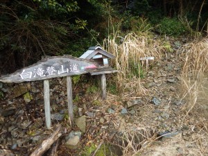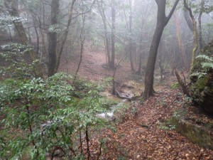 | 沢沿いに歩く | 沢を横断したところに道標 | 急斜面になる |