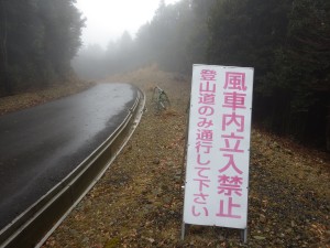 | 舗装道に出ると風車内立入禁止の看板(11:52) | 山頂にて(11:58〜) | 木にワイヤー?(12:25) |