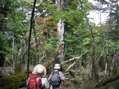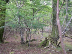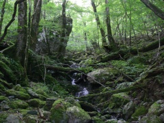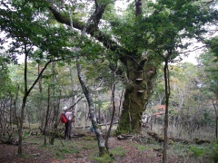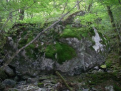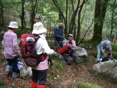 2009年10月11日 天気 晴れ 遊山歩10月例会登山は、脊梁山地を歩くことになった。ちょうど去年の同時期に霧立越を歩き、西の山脈を見て「来年は、あれを歩こう」と話したことを思い出す。今回は一泊となったため参加者は宴会好きのメンバー(笑)でMORIさん夫妻と豊津の信ちゃん&俊ちゃん夫妻と私たち夫婦の6名となった。1日目は、平家の落人の住居跡や原生林と湿地帯の山、「白鳥山」を歩き、2日目は、平家・源氏の子孫が暮らしていると言われている五家荘から烏帽子岳、五勇山、国見岳と縦走する。 <アクセス> 福岡方面からだと御船I.Cが近い。国道218号線を高千穂峡方面へ美里町の三和交差点から右折し国道445号線の山路をひたすら走ると二本杉峠に出る。(雁俣山の登山口あり)そのまま直進し、佐倉荘を過ぎ、樅木吊橋方面へと左折する。高尾酒店、樅木吊橋入口を過ぎると国見岳登山口10kmの標識があるY字路にぶつかるので右に進路をとり、しばらく行くと御池登山口と書かれた標識がある。なお、明日の国見岳は、先ほどの国見岳登山口と書かれた標識からひたすら行くと途中から砂利道となり五勇谷橋ゲート手前に駐車スペースがある。 <コース詳細> 御池登山口と書かれた標識を見て堰堤の奥まで行くと登山道となります。谷間を上り詰めて行くと大きな岩が見えてきます。苔の緑が幻想的な景観を醸し出しています。屋久島ののようです。石がごろごろとしてきて登りつめると道は平坦となり、二つに分かれます。どちらからでも山頂に行けますが、カルスト地形と平清経住居跡を見るために左(真っ直ぐ)に進路をとります。この辺が御池と呼ばれるところのようです。すぐに一の池があってドリーネのあるカルスト地形に出ます。さらに緩やかな上りを歩き平家残党の平清経住居跡の標柱を見てカラ谷との出会いより山頂へと登りつめます。下山は、西側のウケドノ谷方面へと回り込み二の池を見て御池の分岐地点から往路を戻ります。 |