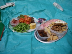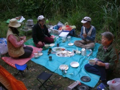 | 五勇谷橋手前でキャンプ | 今夜はダゴ汁とオードブルで | 宴会中 |