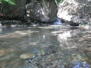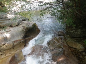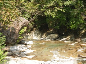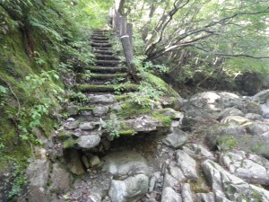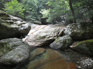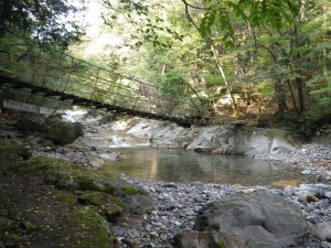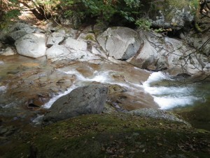 | 黒金尾根コースへ | 橋の下を歩く | 岩がつるつるしてそうだ |