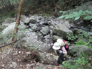 | 巨岩の上にも橋があって渡る | 沢を横断 | 木の橋が崩れている |